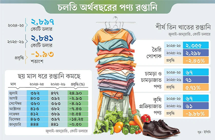 চলতি ২০২৫–২৬ অর্থবছরের শুরুটা আশাব্যঞ্জক হলেও পরের সময়টা রপ্তানি খাতে টেকসই হয়নি। জুলাই মাসে পণ্য রপ্তানি প্রায় ২৫ শতাংশ বাড়ার পর আর কোনো মাসেই প্রবৃদ্ধি ধরে রাখা যায়নি। সর্বশেষ জানুয়ারিতে ৪৪১ কোটি ডলারের পণ্য রপ্তানি হয়েছে, যা এই অর্থবছরের দ্বিতীয় সর্বোচ্চ মাসিক আয় হলেও গত বছরের জানুয়ারির তুলনায় ০.৫০ শতাংশ কম। এর ফলে টানা ছয় মাস ধরে পণ্য রপ্তানি আয় নিম্নমুখী রয়েছে।