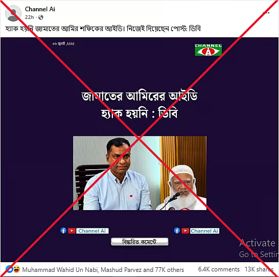 সামাজিক যোগাযোগমাধ্যমে একটি টিভি চ্যানেলের লোগো ব্যবহার করে সেনাপ্রধানের নামে একটি কড়া মন্তব্য ছড়ানো হয়েছে। যাচাইয়ে দেখা যায়, আন্তঃবাহিনী জনসংযোগ পরিদপ্তর জানিয়েছে, ওয়াকার-উজ-জামান এমন কোনো বক্তব্য দেননি। সংশ্লিষ্ট টিভি চ্যানেলও জানিয়েছে, ফটোকার্ডটি তাদের তৈরি নয়।