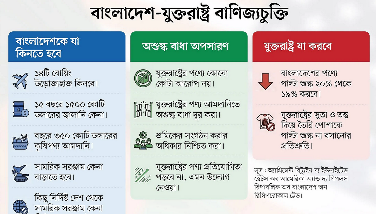 যুক্তরাষ্ট্রের সঙ্গে বাংলাদেশের যে বাণিজ্যচুক্তি সই হয়েছে, তা বাস্তবায়নে বাংলাদেশকে বিভিন্ন ক্ষেত্রে ছাড় দেওয়ার পাশাপাশি সংস্কার করতে হবে। শুল্ক, শ্রম আইন, ডিজিটাল নীতি, কৃষি নিয়ন্ত্রণ, বিনিয়োগ ও জাতীয় নিরাপত্তাসংক্রান্ত বিভিন্ন ক্ষেত্রে বড় ধরনের সংস্কার করতে হবে। সেই সঙ্গে বাণিজ্যঘাটতি কমাতে কিনতে হবে নানা পণ্য।