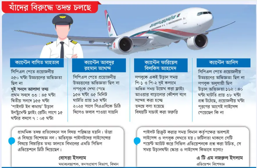 বিমানের অভ্যন্তরীণ তদন্ত প্রতিবেদনে বলা হয়েছে, সাতজন পাইলটের লাইসেন্স ও উড়ানঘণ্টা নিয়ে সন্দেহজনক তথ্য পাওয়া গেছে। তাদের মধ্যে কয়েকজন প্রয়োজনীয় উড়ানঘণ্টা পূরণ না করেই কমার্শিয়াল পাইলট লাইসেন্স পেয়েছেন বলে অভিযোগ রয়েছে। আবার কারো লগবুকে একই উড়ান সময় দুই কলামে দেখিয়ে ঘণ্টা বাড়ানোর তথ্যও পাওয়া গেছে।