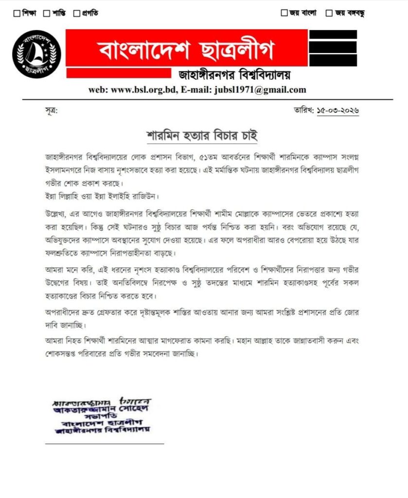 জাহাঙ্গীরনগর বিশ্ববিদ্যালয়ের (জাবি) লোক প্রশাসন বিভাগের ৫১তম আবর্তনের শিক্ষার্থী শারমিনকে নৃশংসভাবে হত্যার ঘটনায় গভীর শোক ও তীব্র নিন্দা প্রকাশ করেছে বিশ্ববিদ্যালয় শাখা ছাত্রলীগ। একইসঙ্গে এই হত্যাকাণ্ডসহ পূর্ববর্তী সকল হত্যাকাণ্ডের দ্রুত ও সুষ্ঠু বিচার নিশ্চিত করার দাবি জানিয়েছে সংগঠনটি।