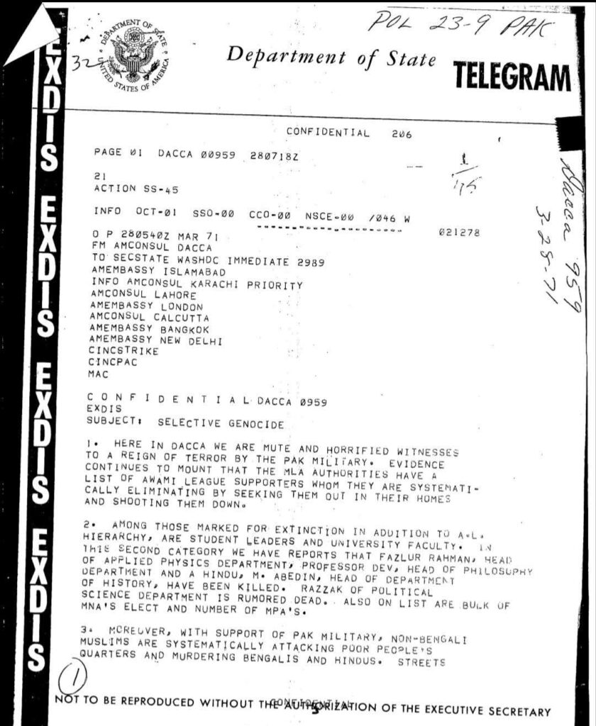২৮শে মার্চ, ১৯৭১। ওয়াশিংটনে মার্কিন স্টেট ডিপার্টমেন্টে পৌঁছায় একটি জরুরি টেলিগ্রাম। যার বিষয়বস্তু ছিল শিউরে ওঠার মতো— ‘সিলেক্টিভ জেনোসাইড’। আর্চার ব্লাড তার বার্তায় অত্যন্ত স্পষ্ট ভাষায় লিখেছিলেন, “আমরা এখানে ঢাকায় পাকিস্তানি সামরিক বাহিনীর এক ভয়াবহ সন্ত্রাসের রাজত্বের মূক ও আতঙ্কিত সাক্ষী হয়ে আছি।” তিনি জানিয়েছিলেন, আওয়ামী লীগ সমর্থক, ছাত্রনেতা এবং ঢাকা বিশ্ববিদ্যালয়ের শিক্ষকদের নামের তালিকা ধরে ধরে পরিকল্পিতভাবে হত্যা করা হচ্ছে।
