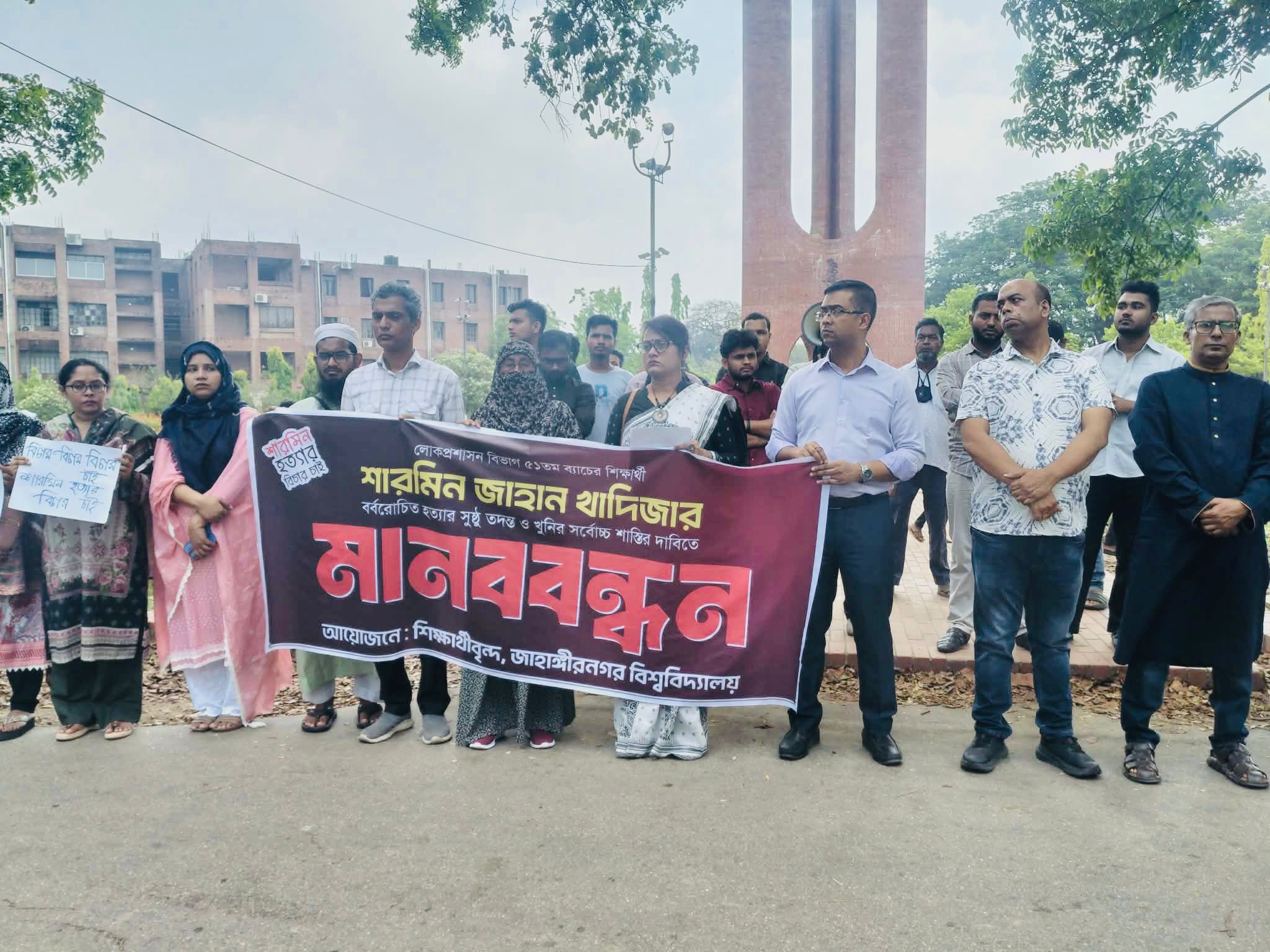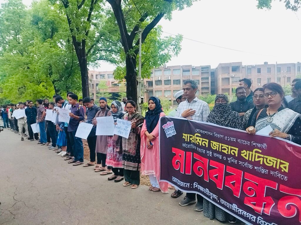জাবি প্রতিনিধি: জাহাঙ্গীরনগর বিশ্ববিদ্যালয়ের (জাবি) লোক-প্রশাসন বিভাগের ৫১তম ব্যাচের শিক্ষার্থী শারমিন জাহান খাদিজার নৃশংস হত্যার সুষ্ঠু তদন্ত এবং খুনির সর্বোচ্চ শাস্তির দাবিতে মানববন্ধন ও মৌন মিছিল করেছে শিক্ষার্থীরা।