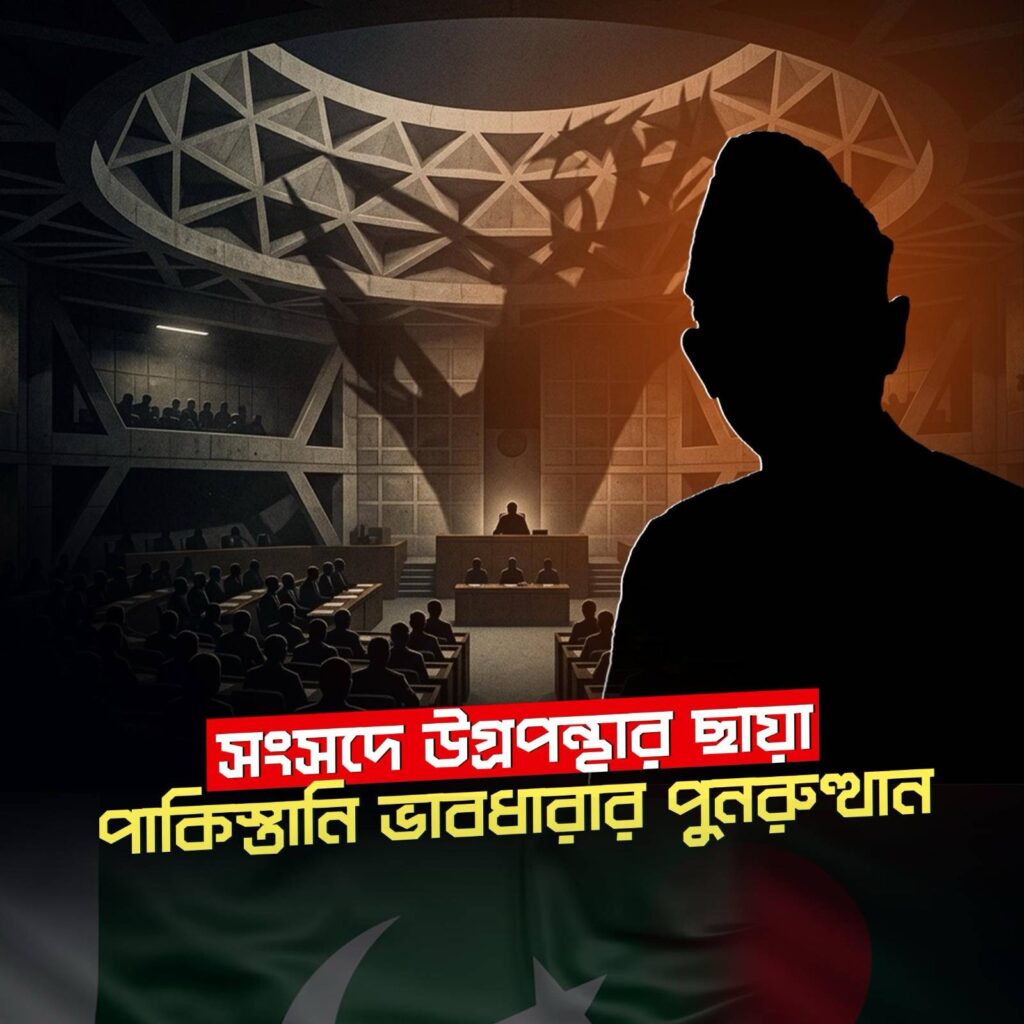 সবচেয়ে আশঙ্কাজনক বিষয় হলো, রাষ্ট্রের ভিত্তিমূল তথা মুক্তিযুদ্ধের ইতিহাস নিয়েও প্রশ্ন তোলা হচ্ছে। বঙ্গবন্ধু, সংবিধান, শহীদ মিনার, জাতীয় স্মৃতিসৌধ এবং জাতীয় সঙ্গীতের মতো জাতীয় পরিচয়ের প্রতীকগুলোকে তর্কের টেবিলে টেনে আনা হচ্ছে। বিশ্লেষকরা সতর্ক করে বলছেন, সংসদের ভেতরে যখন পাকিস্তানি ধাঁচের ধর্মভিত্তিক রাজনীতির প্রতিধ্বনি শোনা যায়, তখন তা শুধু রাজনৈতিক মতভেদ থাকে না; বরং রাষ্ট্রের আদর্শগত কাঠামোর জন্য চরম হুমকি হয়ে দাঁড়ায়। অসাম্প্রদায়িকতা ও বহুত্ববাদের পথে দেশকে ফিরিয়ে আনাই এখন বাংলাদেশের সামনে সবচেয়ে বড় চ্যালেঞ্জ।
