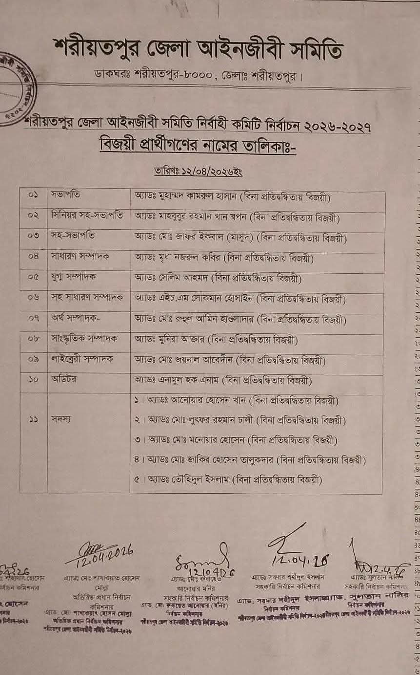 গণতন্ত্রের অন্যতম স্তম্ভ হিসেবে পরিচিত আইনজীবী সমিতির নির্বাচনেও এবার কলঙ্কিত অধ্যায় যুক্ত হওয়ার অভিযোগ উঠেছে। শরীয়তপুর জেলা আইনজীবী সমিতির ২০২৬-২০২৭ সেশনের নির্বাহী কমিটি নির্বাচনে পদের বিপরীতে কোনো প্রতিদ্বন্দ্বী না থাকায় সব কটি পদে প্রার্থীরা ‘বিনা প্রতিদ্বন্দ্বিতায়’ জয়ী হয়েছেন। তবে এই জয়কে সাধারণ আইনজীবীরা দেখছেন ‘জোরপূর্বক ক্ষমতা দখল’ হিসেবে।