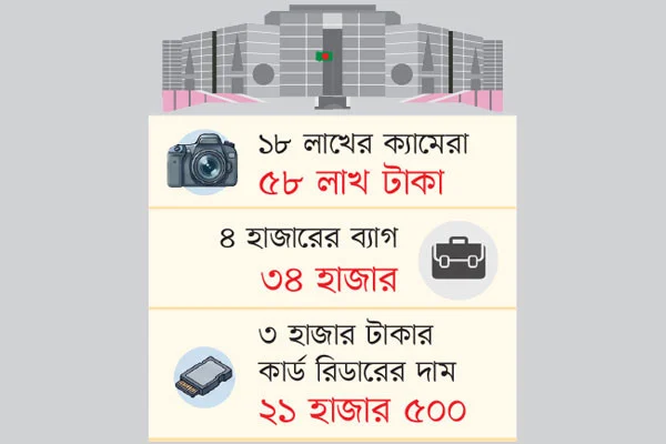 অনুসন্ধানে দেখা গেছে, মাত্র ৪ হাজার টাকা বাজারমূল্যের একটি সাধারণ ব্যাগের দাম ধরা হয়েছে ৩৪ হাজার ৪০০ টাকা। ব্র্যান্ডের নাম লেখা থাকলেও সরবরাহ করা হয়েছে অত্যন্ত নিম্নমানের ব্যাগ, যাতে লোগো লাগানো হয়েছে আলাদাভাবে। একইভাবে ৩ হাজার টাকার কার্ড রিডারের দাম নেওয়া হয়েছে ২১ হাজার ৫০০ টাকা। ক্যামেরার প্রধান যন্ত্রাংশ তথা বডির ক্ষেত্রেও ঘটেছে অস্বাভাবিক মূল্যবৃদ্ধির ঘটনা। ৩ লাখ ৩৮ হাজার টাকার ডিজিটাল স্টিল এসএলআর ক্যামেরার বডির দাম ধরা হয়েছে ৭ লাখ ৯ হাজার ৫০০ টাকা।