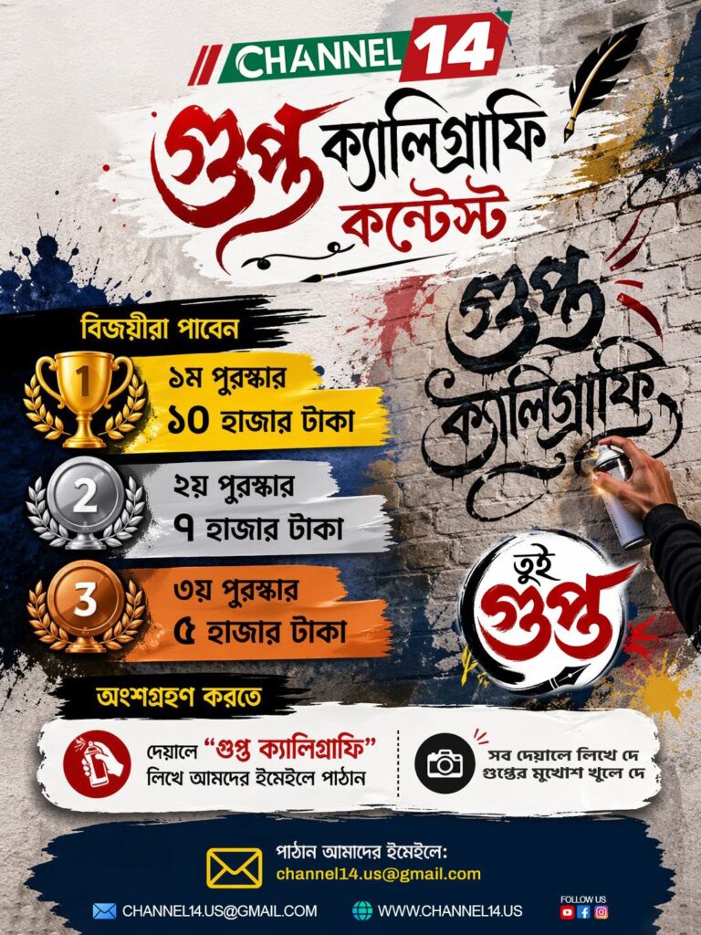 শিল্প-সাহিত্য ও সৃজনশীলতাকে উৎসাহিত করতে এবং গুপ্ত রাজনীতিকে নিরুৎসাহিত করতে ব্যতিক্রমী উদ্যোগ নিয়েছে চ্যানেল ফোরটিন। সম্প্রতি প্রতিষ্ঠানটি ঘোষণা করেছে ‘গুপ্ত ক্যালিগ্রাফি কনটেস্ট’, যেখানে অংশগ্রহণকারীদের জন্য থাকছে আকর্ষণীয় পুরস্কার এবং নিজেদের ক্যালিগ্রাফি প্রতিভা তুলে ধরার সুযোগ।