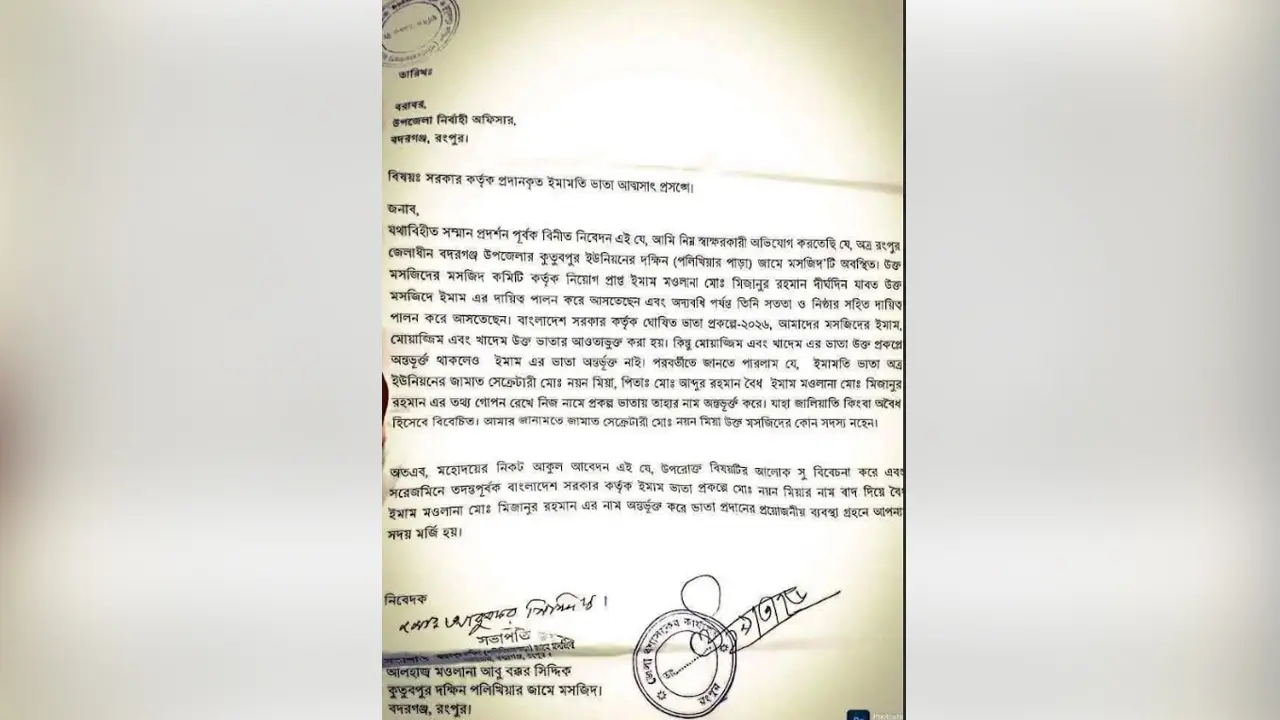 অভিযোগ সূত্রে জানা যায়, বদরগঞ্জ উপজেলার কুতুবপুর ইউনিয়নের দক্ষিণ পলিখিয়ার জামে মসজিদের নিয়োগপ্রাপ্ত ইমাম হিসেবে মাওলানা মিজানুর রহমান দীর্ঘদিন ধরে দায়িত্ব পালন করছেন। সরকার ঘোষিত ২০২৬ সালের ইমাম, মুয়াজ্জিন ও খাদেম ভাতা প্রকল্পে ওই মসজিদের খাদেম ও মুয়াজ্জিনের নাম থাকলেও ইমাম মিজানুর রহমানের নাম বাদ দেওয়া হয়েছে। সেখানে জালিয়াতির মাধ্যমে ইমাম হিসেবে জামায়াতে ইসলামীর কুতুবপুর ইউনিয়ন শাখার সেক্রেটারি নয়ন মিয়ার নাম তালিকাভুক্ত করা হয়েছে।